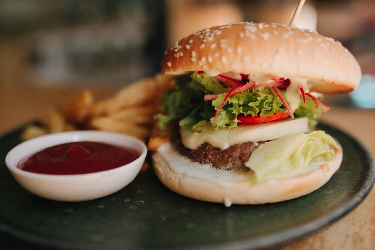 Булочка, соковита котлета з телятини, помідор, огірок квашений, майонез, соєвий соус, лист салату, сир моцарелла, карамелізована цибуля + картопля фрі, соус медово-гірчичний.