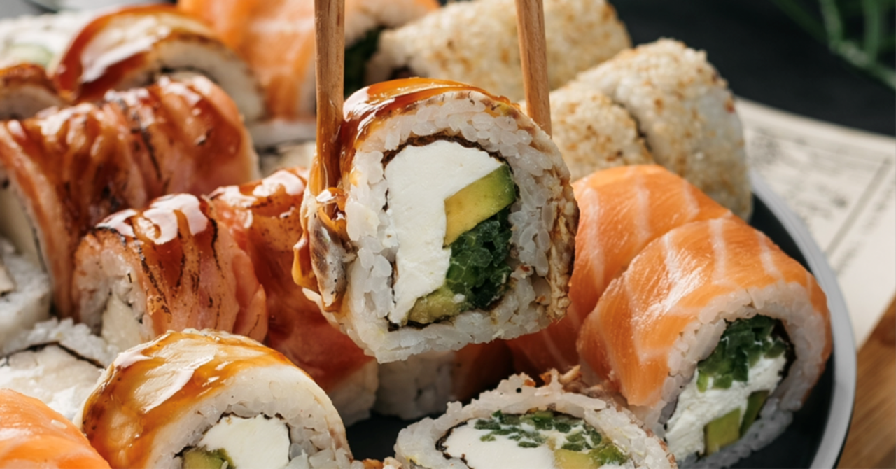 Норі, рис, салат, крем-сир, лосось, креветки темпура, хіяші, кляр темпура, пластівці панко, соус горіховий