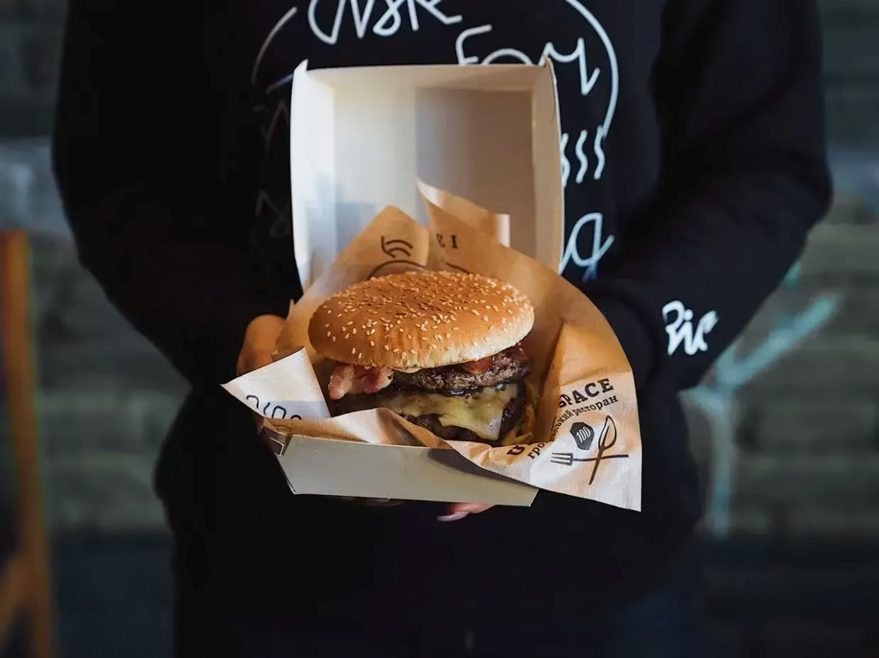 Склад: булка, теляча котлета, бекон, Чеддер, домашній майонез, карамелізована цибуля, маринований огірок.