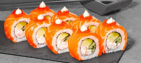 280 г Рис, лосось, авокадо, огірок, майонез, крабовий мікс, ікра тобіко, норі