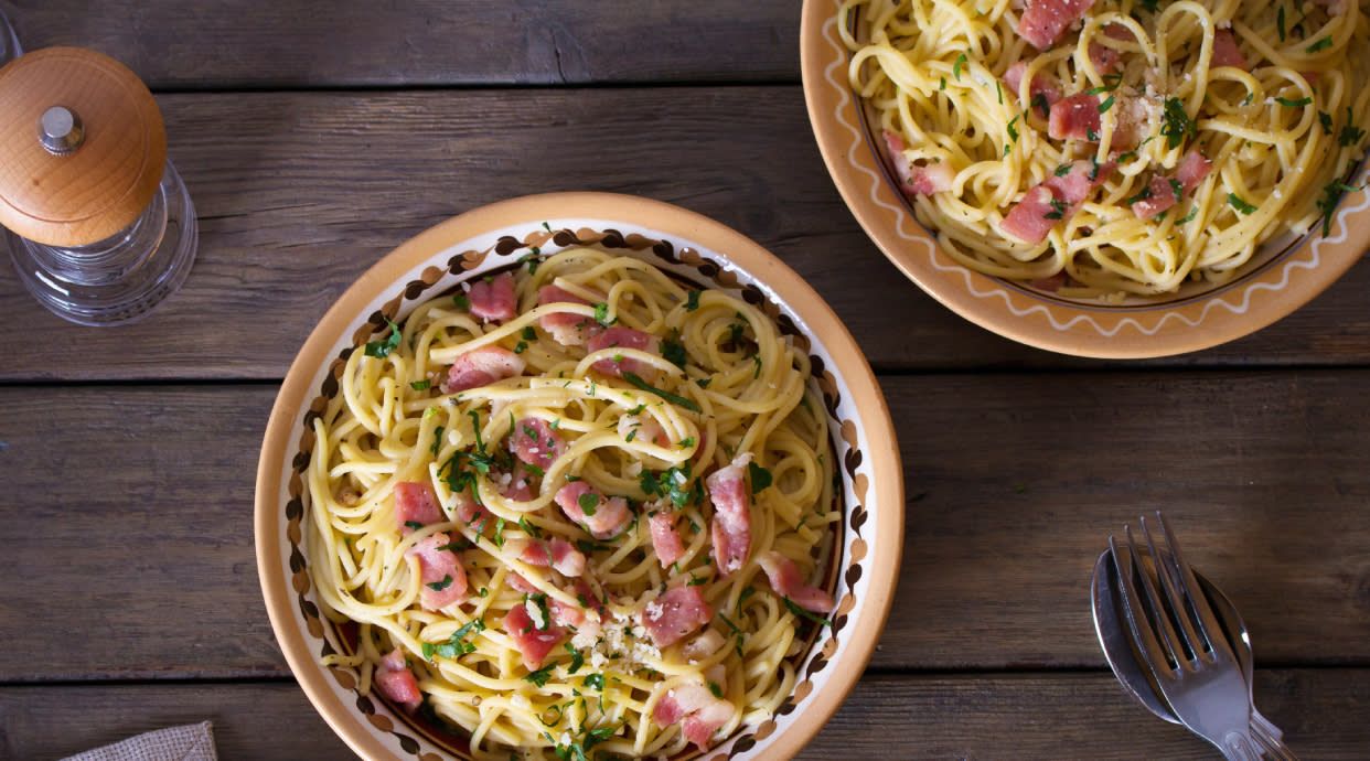 Спагетті, бекон, яйце, вершки, сир Пармезан, вино біле сухе, олія, бальзамічний крем, паприка, італійські трави, сіль, перець, базилік