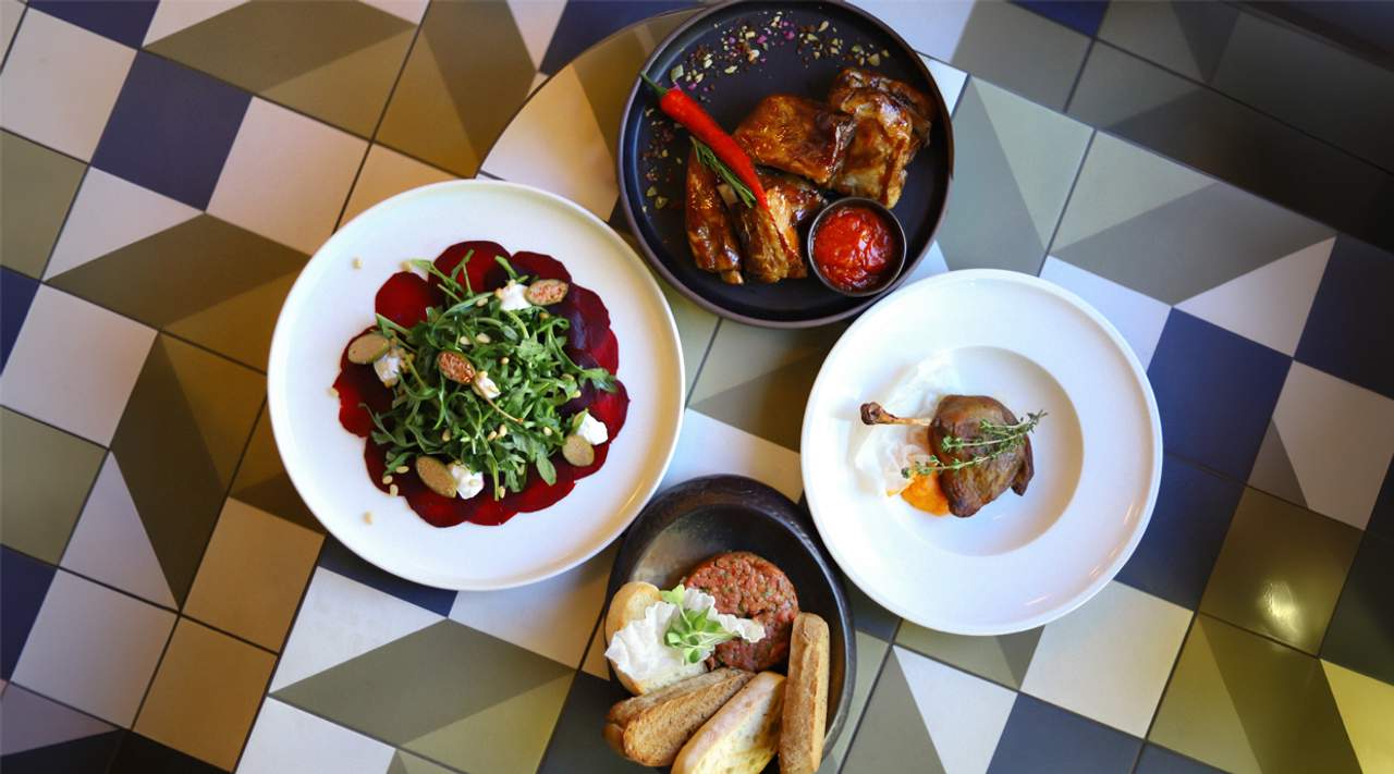 Буряк запечений у дров’яній печі у поєднанні з ніжним вершковим мусом, руколою, каперсами та підсмаженими кедровими горіхами, заправлений кунжутною олією