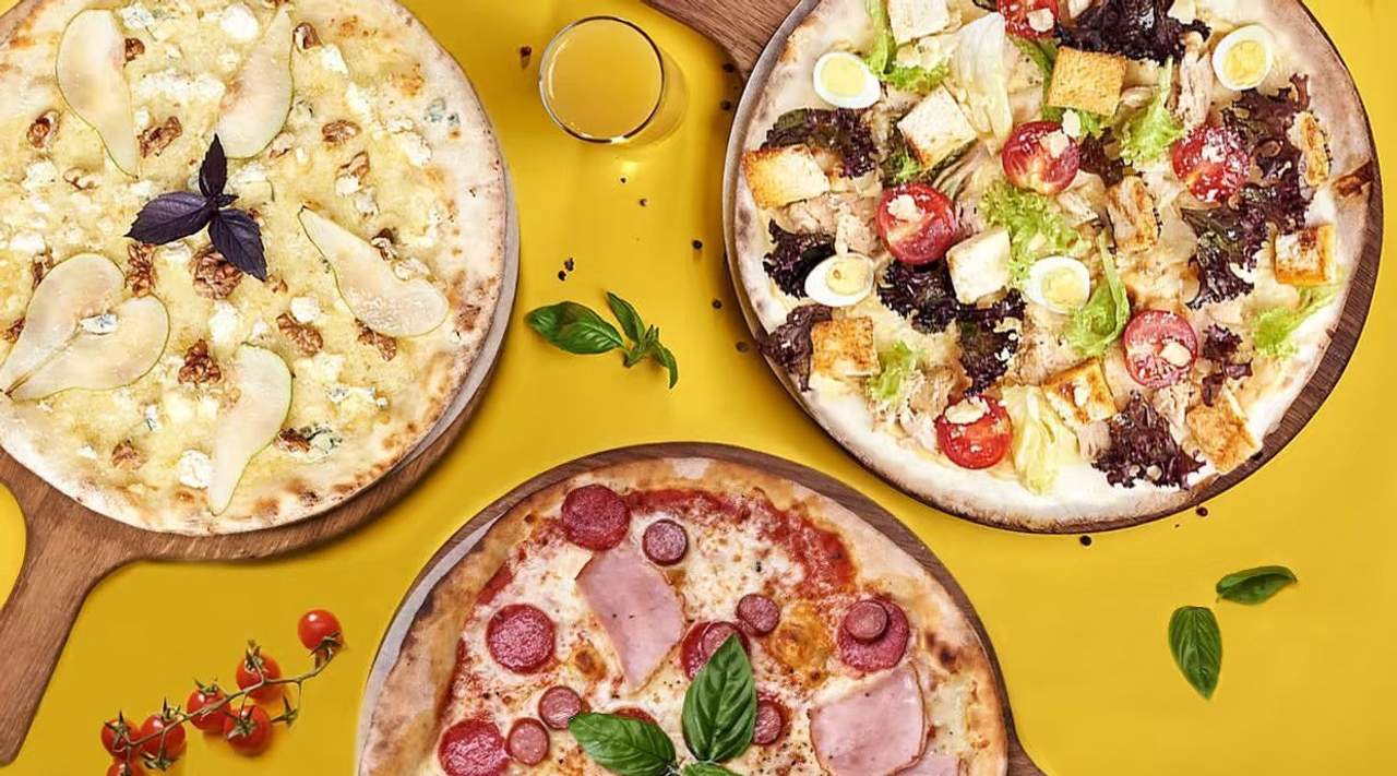 соус томатний, сир моцарела, шинка, запечене яйце, баварські ковбаски