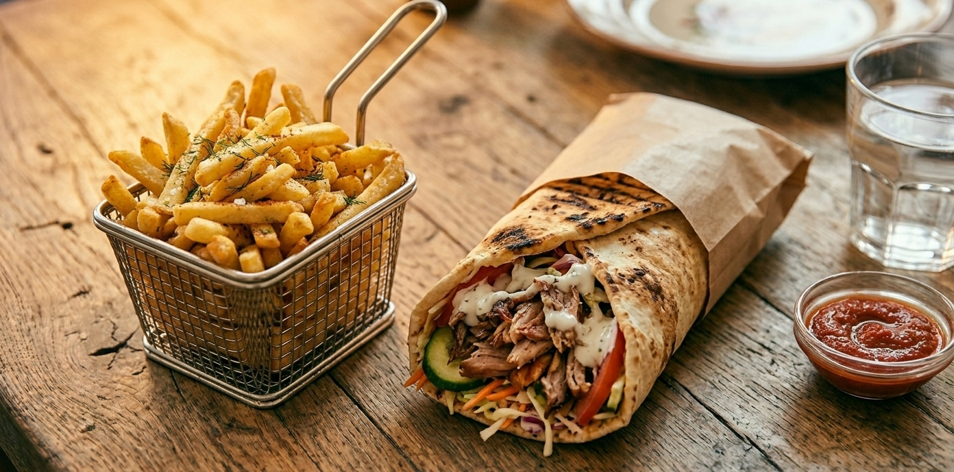 Лаваш, м'ясо куряче, м'ясо свинини, сир Моцарелла, цибуля маринована, огірок маринований, помідори, мікс-салат, соус Часниковий, соус Барбекю