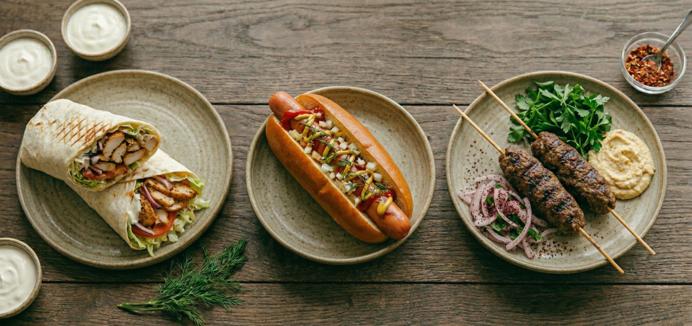 Сосиски, лаваш, морква по корейські, зелень, огірки квашені, капуста, Фірмові соуси