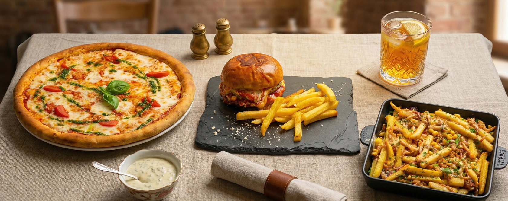 Булочка бріош, котлета яловича, помідор, огірок маринований, салат айсберг, карамелізована цибуля, сир чедер, соус часниковий, картопля фрі
