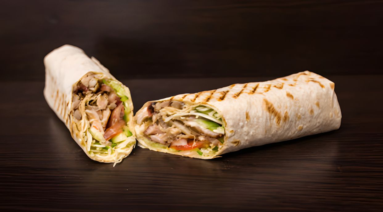 Свіжий лаваш, мʼясо куряче, молода капуса, томати, маринований огірок, соус на основі йогурту, соус з томатів Пелатті, зелень