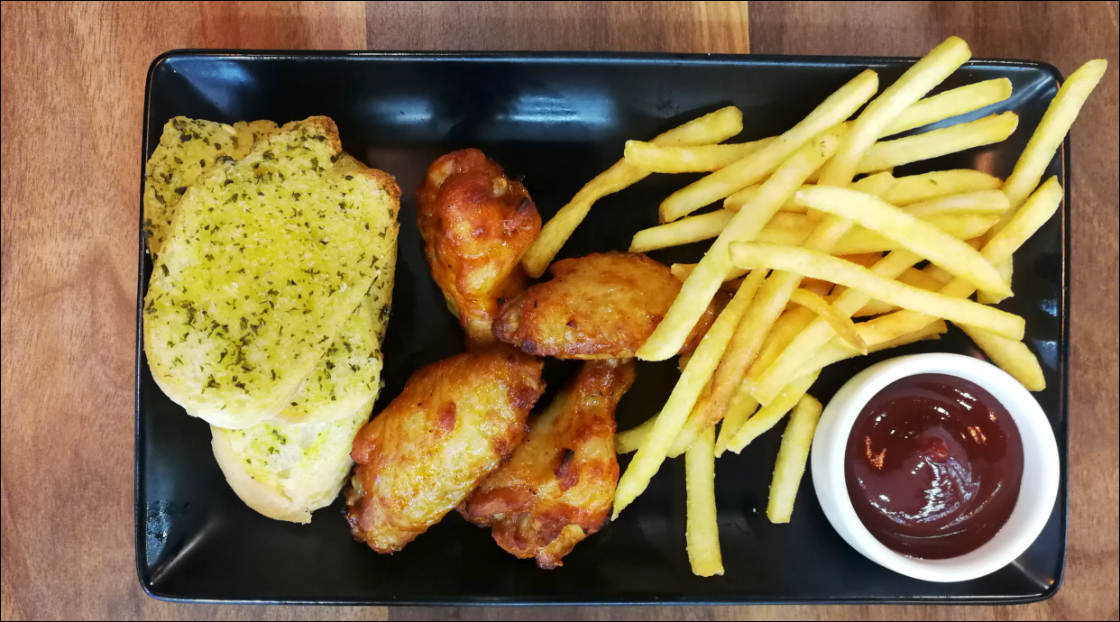 Крила курчати в соусі BBQ власного виробництва, з картоплею фрі