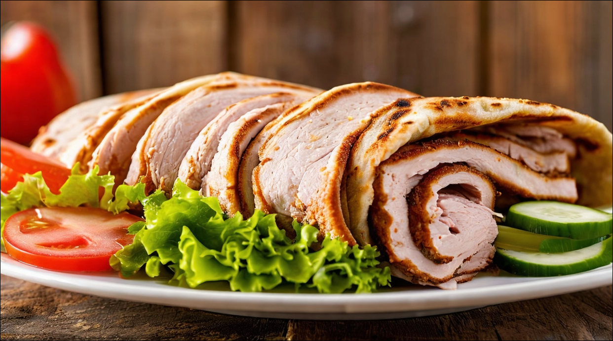 Ніжні підсмажені шматки свинини, завернуті в лаваш, подаються з асорті свіжих овочів та нашого Фірмового соусу