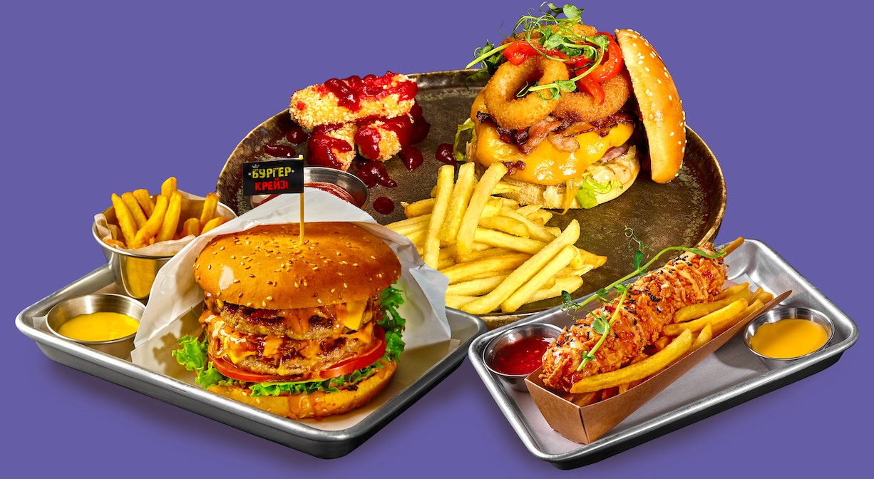 Комбо «Crazy Party» — набір популярних закусок та бургерів для веселих компаній: курячі стріпси, курячі нагетси, бургер «Крейзі», бургер «Цезар» та журавлинний соус.