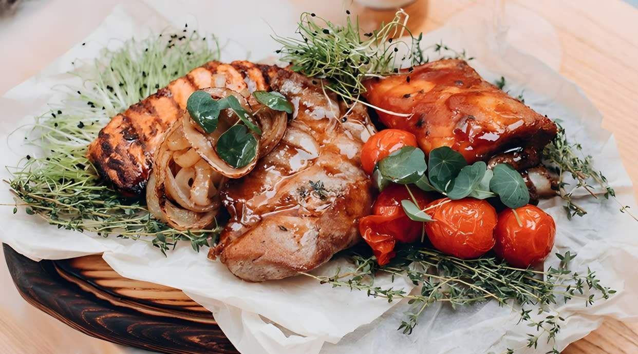 Три види м’яса: свинина, яловичина та курка. Подається з картоплею, цукіні гриль, маринованою цибулею та соусами барбекю і сирним. Насичений аромат і ситність.