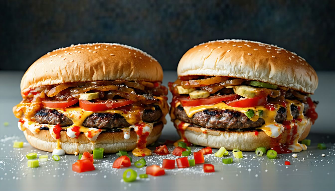Булочка картопляна, соус Бальзамічний, огірки солоні, цибуля, дві яловичі котлети та подвійна порція сиру Чеддер