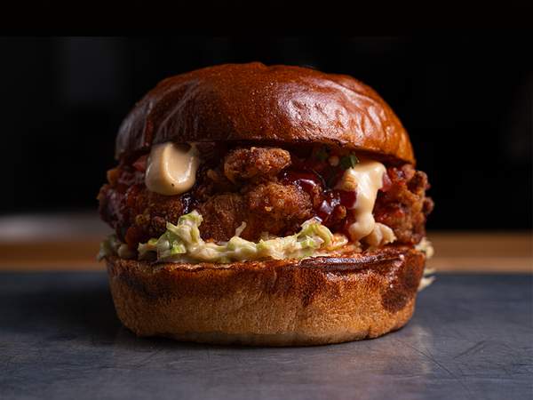 Мариноване курча в паніровці, зверху глазур з меду та кочуджану, коул слоу, сальса томатна, місо майо