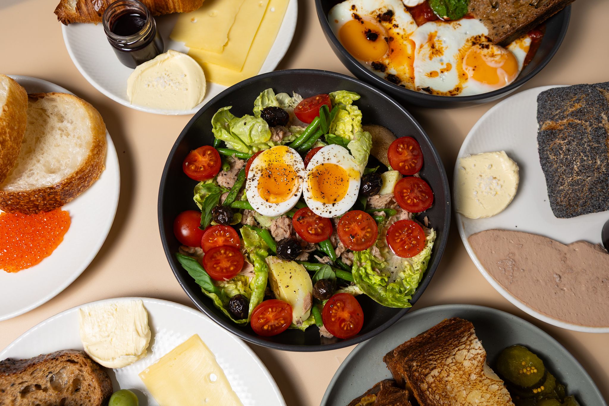 Хліб сордо хані-мейд, збите вершкове масло, трояндовий джем, сир Гауда, домашня вершкова рікотта, печені перці, лосось гравлакс, варене яйце, свіжі сезонні овочі та зелень, печений буряк, сальса верде з каперсами та анчоусами. Алергени: глютен, молочні п