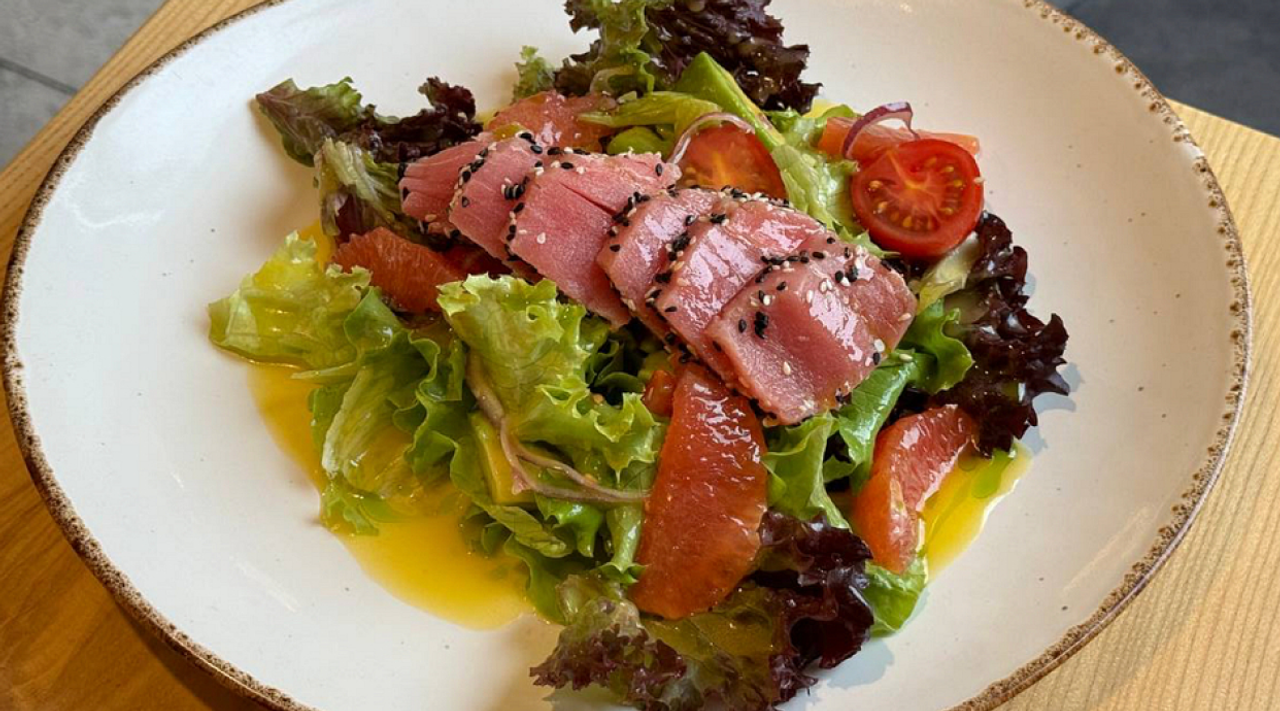 Крендель-бургер з тальятою із тунця, авокадо, ікрою Тобіко (300г)
