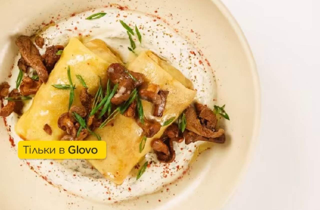 Подаються зі смаженими грибами, грибним соусом та соусом жу, зеленою цибулею, шпинатом та сметаною.