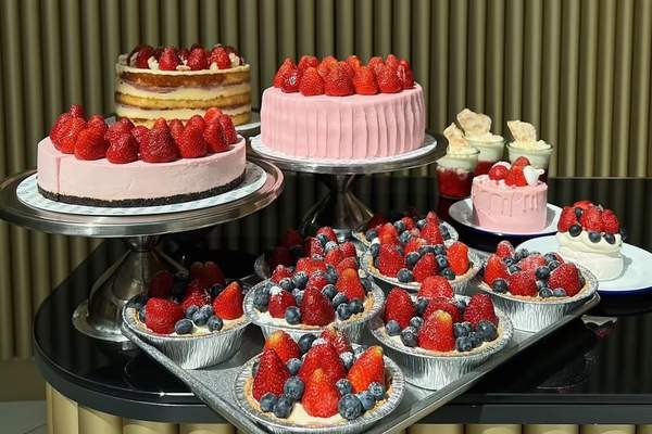 Варіація на тему відомого англійського торту: малинові і мигдалеві коржі та мус збілого шоколаду у поєднанні зі свіжою полуницею