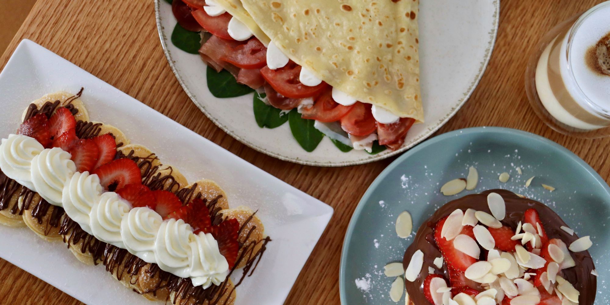 млинець (Ø 40 см), полуниця, нутелла, кокосова стружка, цукрова пудра. Вага: 240 г. Алергени: 1a, 3, 6, 7, 8b
