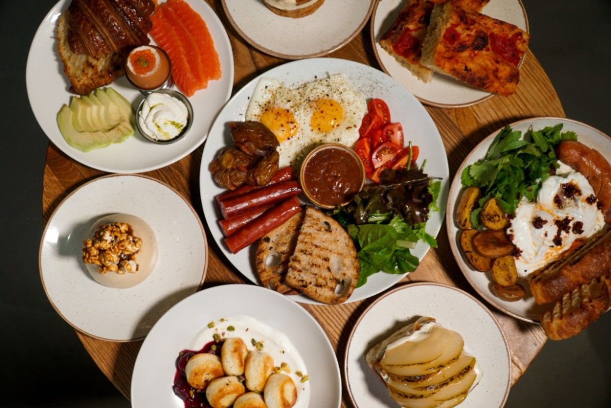 Слабосолений лосось, скрембл, помідор, редис картопля, зелений салат,соус лабне та грильований хліб