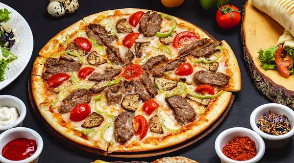 Соус Пелатті, моцарела, фарш смажений зі спеціями(яловичина-свинина), смажені печериці з цибулькою, помідорчик. Рекомендуємо з фірмовим часниковим соусом 650 грам