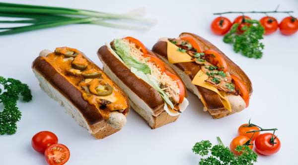 Булочка бріош, молочна сосиска, салат коул слоу з фіолетової капусти, кукурудза, цибуля кріспі, кетчуп, гірчиця, майонез та соус на основі двох видів сиру: чедеру та моцарели
