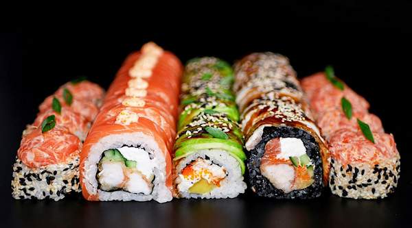 Філадельфія з лососем. Каліфорнія з лососем в ікрі. Чіз рол з лососем. Спайсі рол. Макі з лососем.Вага: 1205г