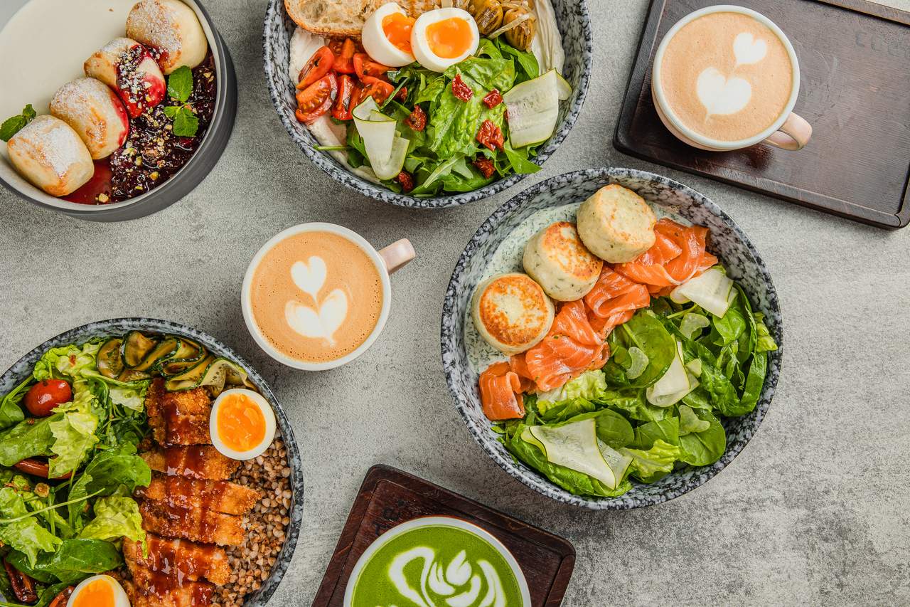 Зі скрамблом, страчателлою, маринованими в меді чері, свіжим салатом та слабосоленим лососем
