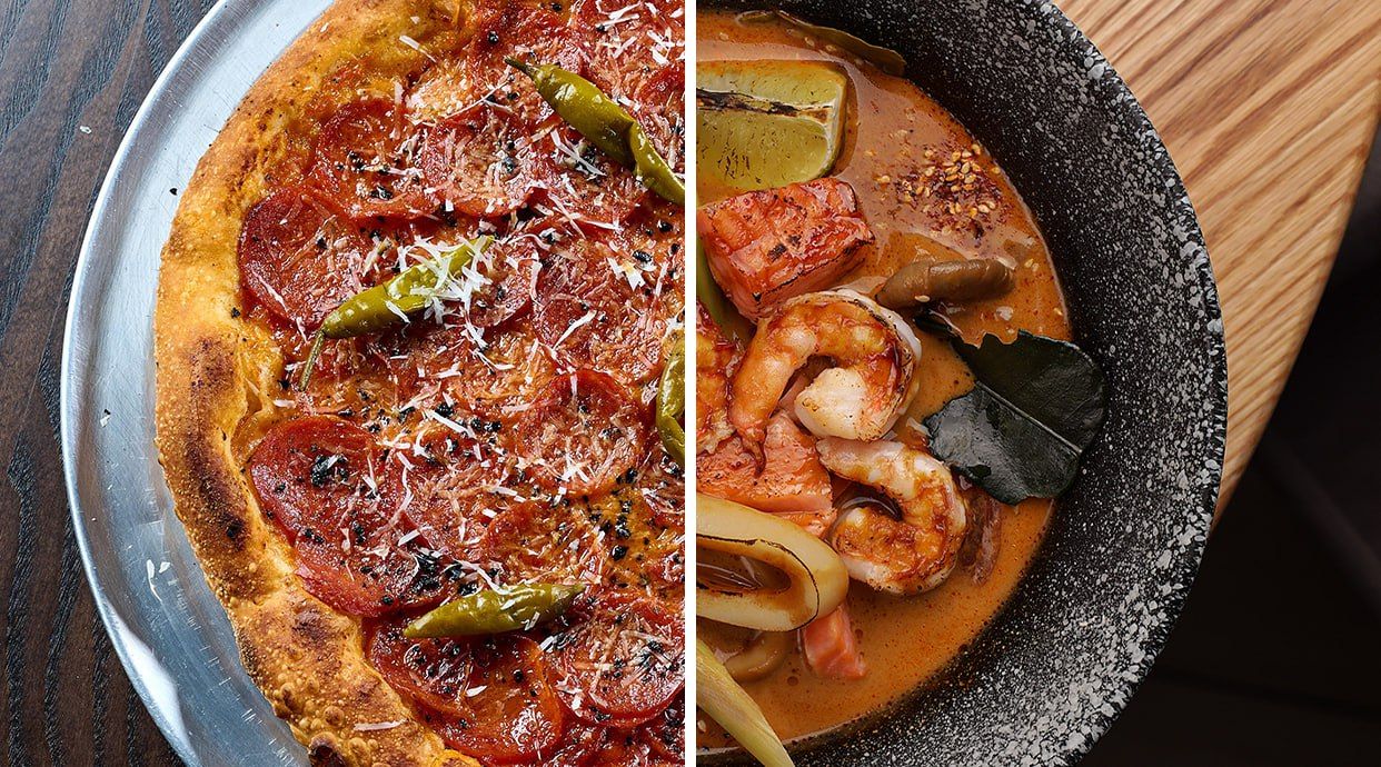 Насичений рибний бульйон з крафтовою локшиною та морепродуктами: лосось, креветка, мідія та кальмар з додаванням маринованого яйця, спецій шишимі тагараші та чіпсом норі, зеленою цибулею, перцем чилі, лимоном та сіллю кациобуші *Містить алергени: продук