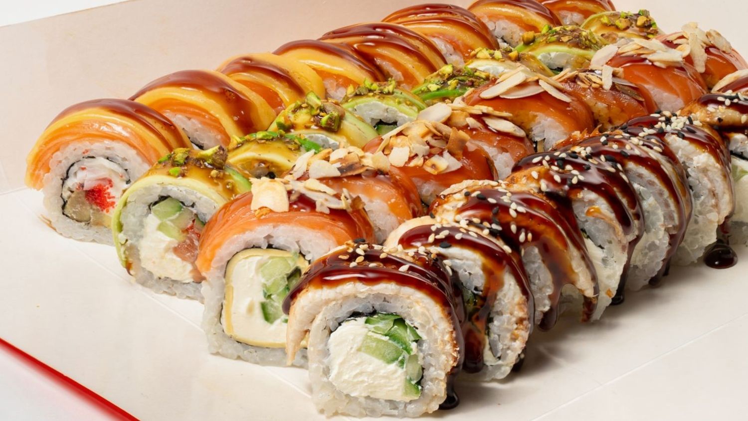 Філадельфія з вугрем, Дракон з креветкою, Дракон Лосось-Дорблю, Рол Чіз з тунцем, Запечений рол від шефа (не належить до категорії теплих)
