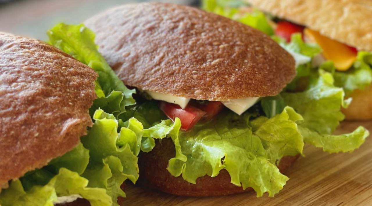 Смачний та ароматний італійський хліб із шинкою, крем-сиром, листям салату, сиром тостовим, помідором, соусом песто