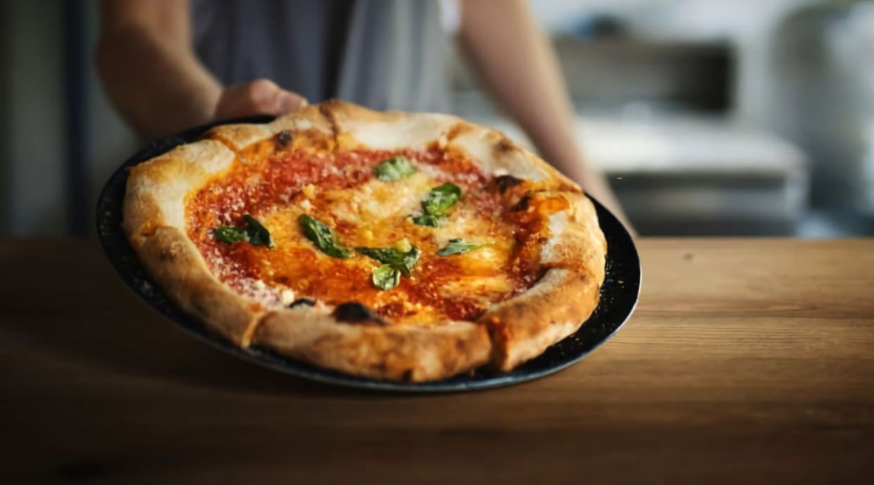 Ніжна піцца поєднує в собі солодкий смак груші з медом та насиченний смак сиру горгонзола та доповнюється справжнім італійським прошутто