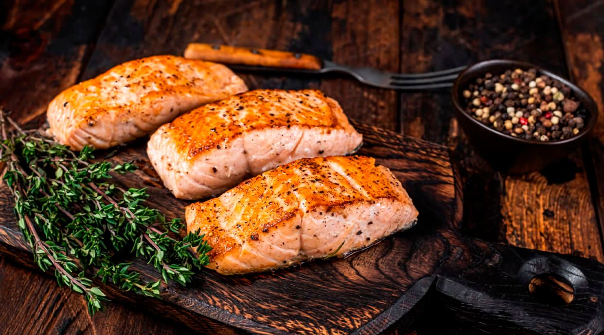 Стейк з лосося гриль подається з броколі, помідорами чері, каперсами в соусі вершковий песто, на завершення прикрашається базиліком.