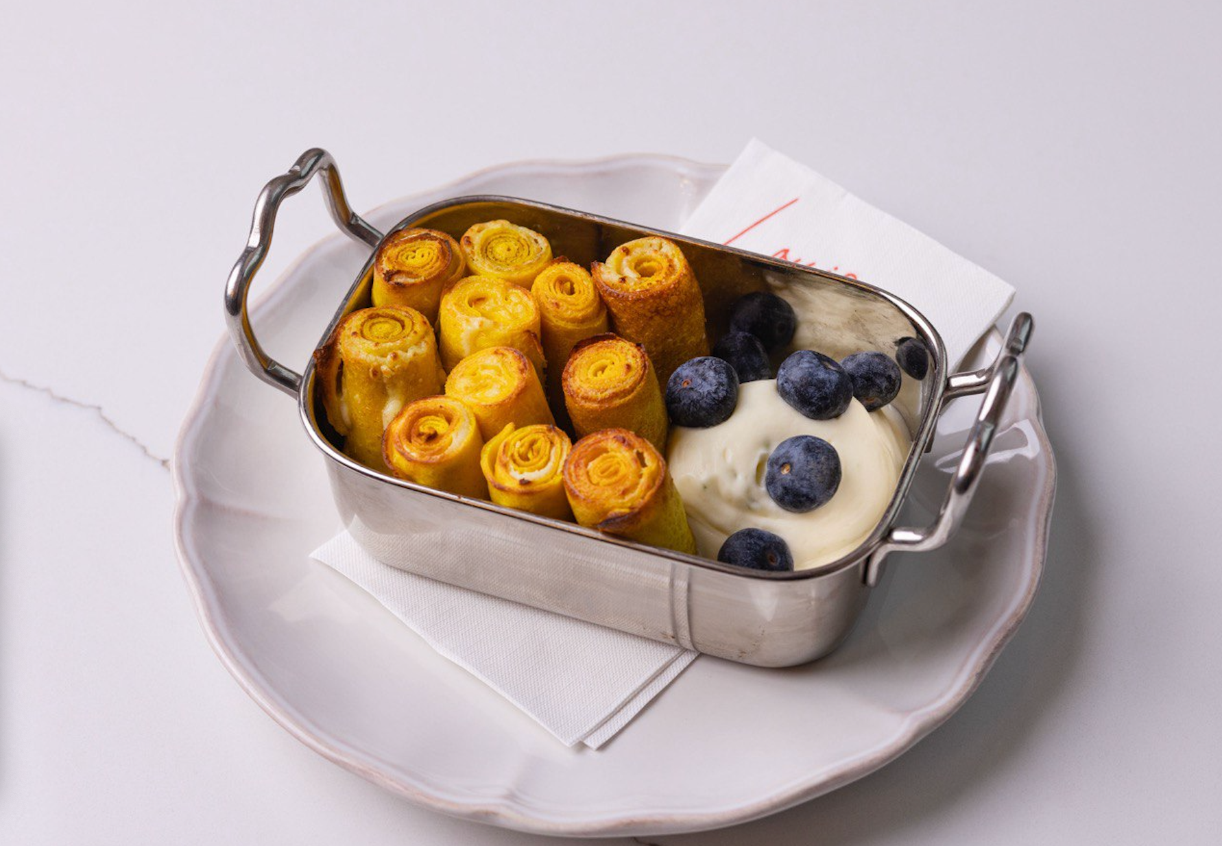 омлет з додаванням чорнила каракатиці, креветками, гуакамоле з соусом Тонато. Подаємо з томатами конфі, мікрозеленню, нитками чілі та бріошем