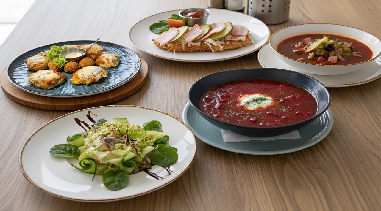 Борщ з м’ясом та сметаною; подається з чорним хлібом та салом