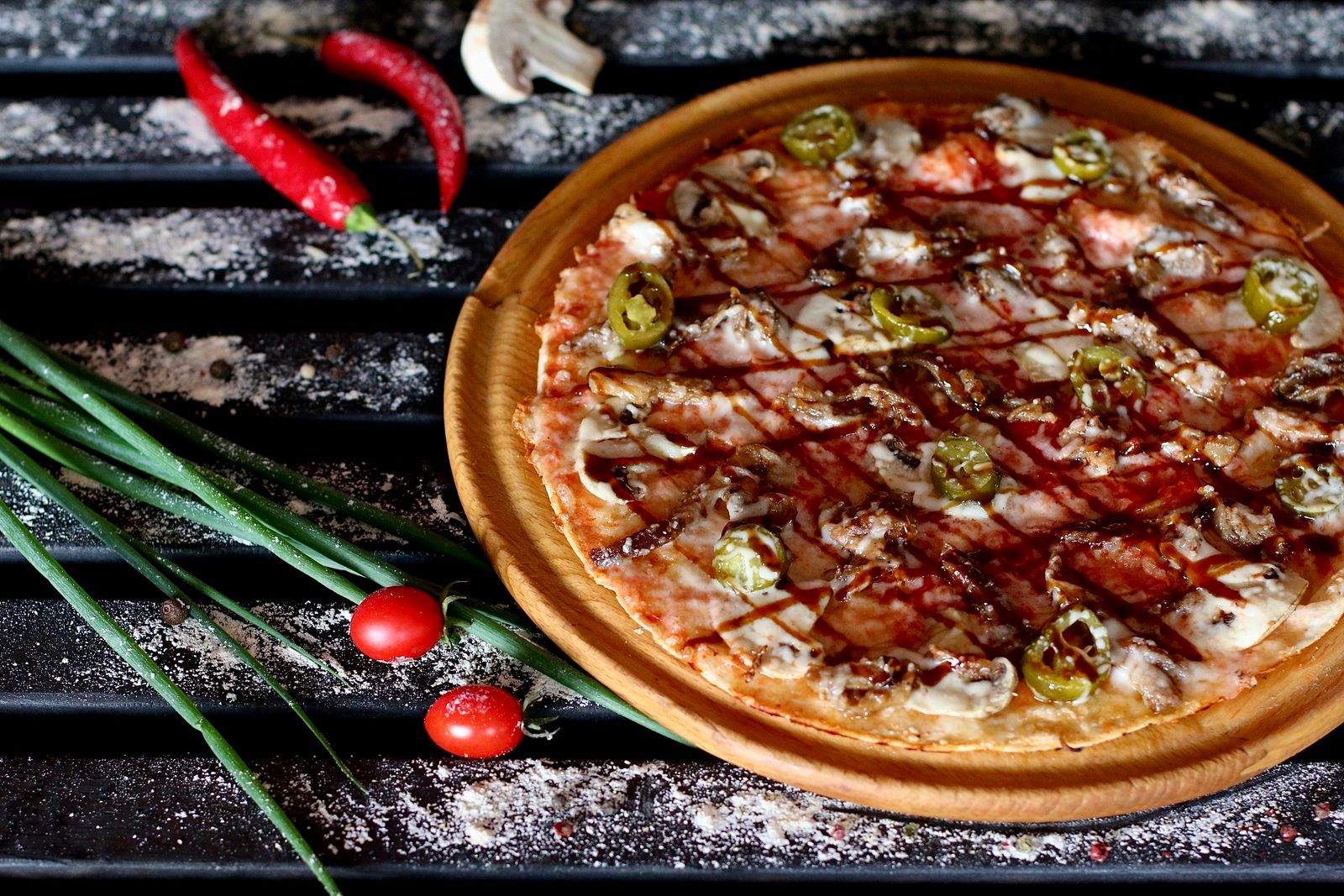 Піца на будь який смак. Склається з трьох смаків. В першому поєдуються Мисливські ковбаски, маринований огірок та свіжий перець Чілі. В другому гриби Печериці, томати та шинка. В третому курятина, ананас та кукурудза. Піцу готуємо на Тматній основі з сиром Моцарела