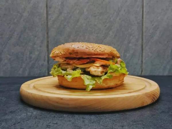 Пшенична булка, куряче філе в паніровці, бекон, сир Cedro, салат, болгарський перець запечений на грилі, помідор, соус BBQ